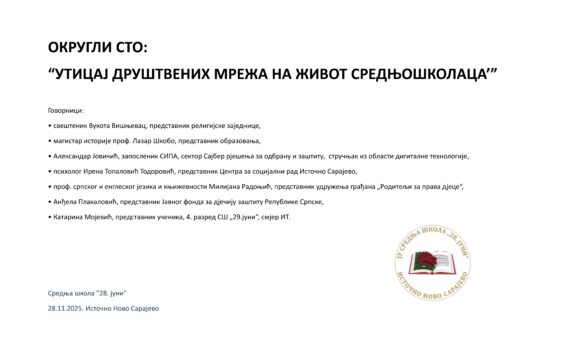ЈУ Средњa школa „28. јуни“ Источно Ново Сарајево организовала је округли сто о теми “Утицај друштвених мрежа на живот средњошколаца’”. Учесници су разговарали о позитивним странама и ризицима које са собом носи свакодневно коришћење мрежа. Овом приликом било је ријечи и о утицају друштвених мрежа на развој самопоуздања, пажње и […]