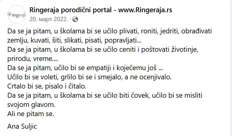 Крајње је вријеме је да школама вратимо образовну функцију, ауторитет просвјетним радницима и родитељима, да образују и васпитавају дјецу онако како су нас генерацијама васпитали и образовали, без полиције, центара за социјални рад, „тимова“, „рефералних механизама“.
