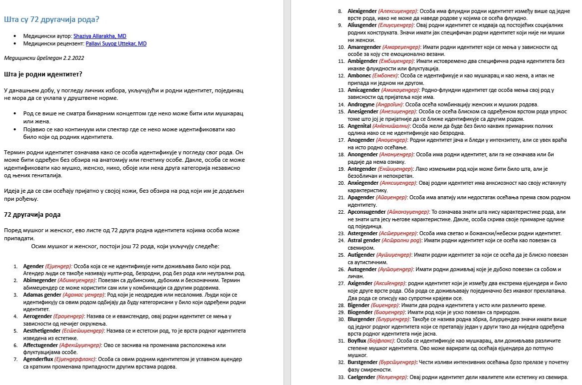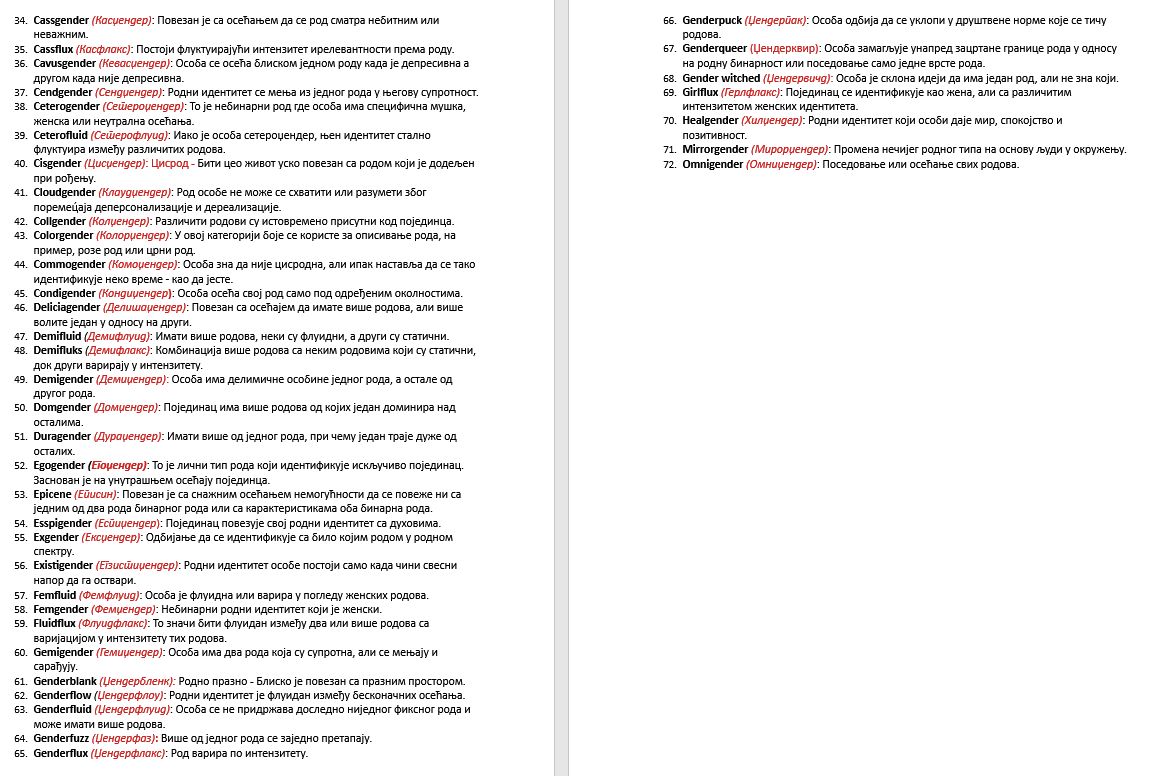 Овим речима социолог, проф. др Слободан Рељић прокоментарисао је списак на коме се, осим мушког и женског рода, налазе још 72 родна идентитета, односно џендера. На том списку, који су светски борци за људска права марљиво саставили, родови су наведени на енглеском језику по абецедном реду, па свако ко се не осећа ни као мушкарац, ни као жена, може да узме листу и за себе пронађе и види – шта је.