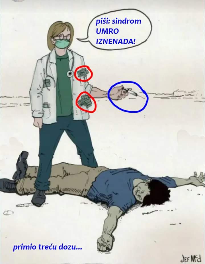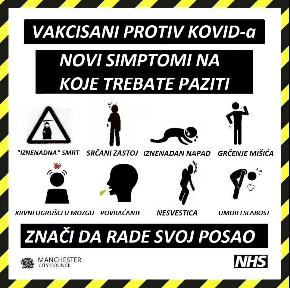 | Непостојећи „постковид“ синдром | Сваки „риједак или непознат до сад“ симптом и нуспојава, убачен је као узрок здравственог проблема или смрти од КОВИДА. Напомена: јасно је да понекад остају посљедице прележане болести, али кад болест има неограничен број симптома, то не може да буде синдром. Дио симптома је уствари видљива нуспојава опасних лијекова који су се користили у лијечењу ковида, и/или „вакцина“ које су људи примили, као и прикривање љекарских грешки, незнања и незаинтересованости за утврђивање правог узрока симптома или смрти пацијента- за све то је фантастичан израз: „то је посљедица ковида“. |