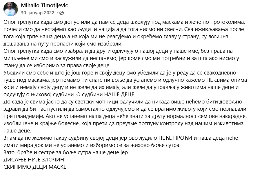 Ипак највећи проблем су и даље они родитељи који на све што се дјеци намеће, под изговором борбе за јавно здравље, и даље ћуте. Осим дијела родитеља, нико од надлежних се не бави овим питањима, нити тражи начин да се спријечи још већа штета по физичко и ментално здравље дјеце у наредној школској години.