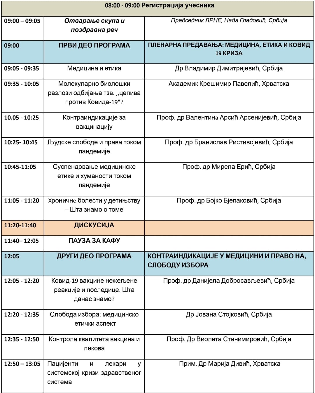 О искуствима институционалне борбе говорила је бивша народна посланица Радмила Васић. О медицини, слободи и етици из визуре хришћанства, са освртом на вантелесну оплодњу, предавање је одржао отац Јован Пламенац из Црне Горе. О искуствима борбе родитеља говорила је Марина Манић, повереник ЛРНЕ из Ниша, а о стању у Републици Српској говорила је Јелена Сарафијан из удружења ,,Родитељи ЗА права деце” из Бијељине. О односу здравља (медицине) и ,,зелене агенде” и очувања природе говорили су биолог Александра Кнез Милојковић и еколошки активиста Звездан Калмар. На крају, скупу се обратила председник ЛРНЕ Нада Гладовић. Између предавања, вођена је и жива дискусија, у којој је учествовала и тужитељка Вишег јавног тужилаштва Јасмина Пауновић.