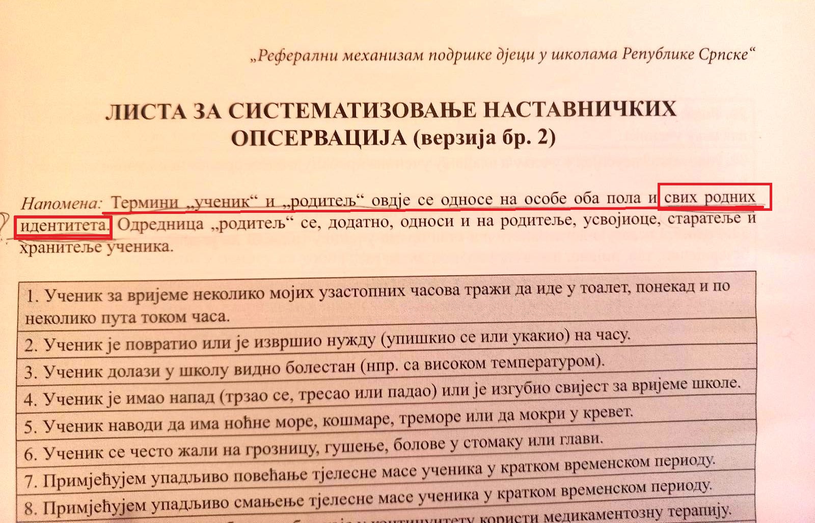 [4] Реферални механизам подршке дјеци у школама Републике Српске је документ који је тешко доступан особама изван образовног система. Служи као подршка наставном кадру и стручној служби школе како би свакодневно вршили писане опсервације стања и понашања дјеце и њихових родитеља у основиним и средњим школама РС. Опсервације треба да се редовно заводе у васпитно-образовни картон ученика (ученички досије). Основне школе су дужне да, службаним путем, на захтјев средњих школа, доставе васпитно-образовни картон средњој школи у коју је ученик уписан. У Рефералном механизму стоји напомена да се термин “ученик” и “родитељ” односе на особе оба пола и свих родних идентитета.